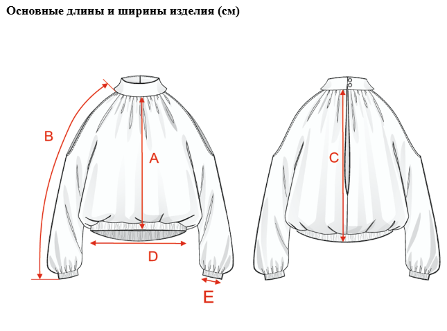 Выкройка блузы большого объема укороченного силуэта, длиной до талии, с цельнокроеными рукавами. Воротник стойка. Под стойкой на горловине сборка. На рукавах в районе плеч разрезы. Манжеты и низ блузы обработаны подгибкой с резинкой. Застежка на стойке сзади на две навесные петли и пуговицы, спинка с центральным швом оформлена застежкой «щель».