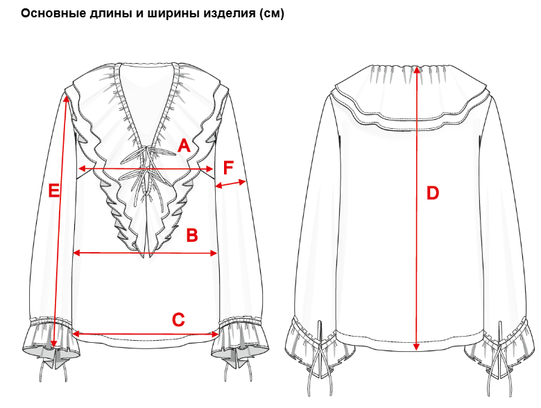 Блуза женская прямого силуэта, умеренного объема. На деталях переда нагрудные вытачки, а на деталях спинки плечевые. Вырез горловины глубокий, v-образный, обработан рюшами и бейкой, с притачными завязками по переду. Рукава втачные, одношовные, длинные. Разрез на рукаве обработан бейкой, нижние срезы – рюшами с кулиской, в которую продеты завязки. Низ блузы фигурный, длина до линии бедер.