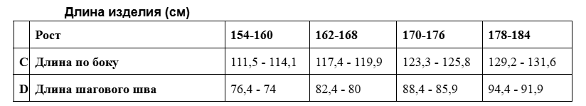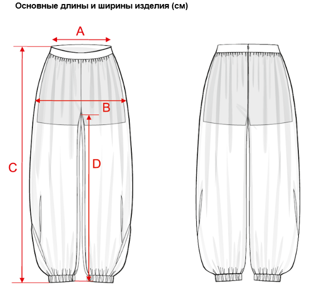 Брюки женские, большого объёма, без бокового шва, на подкладе. Пояс притачной на уровне линии талии. В среднем шве задних половинок брюк застежка на потайную тесьму «молнию». По нижнему срезу с боковой стороны встречные складки, которые заходят друг на друга. Низ обработан притачной манжетой, собранной на эластичную тесьму. Длина брюк до щиколотки.