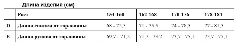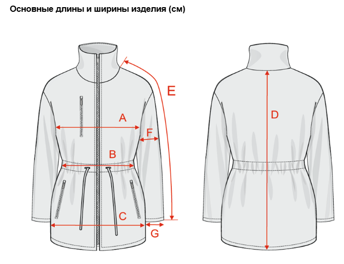 На полочке расположены прорезные карманы: два ниже линии талии и один нагрудный карман с правой стороны. По центру изделия находится застежка-молния, которая доходит до верха стойки на горловине. По талии проходит кулиска со шнурком из основного материала.