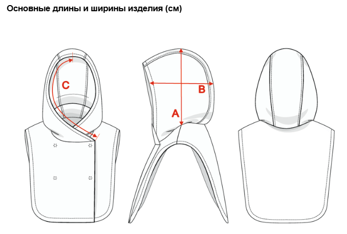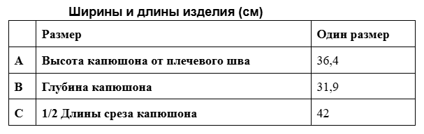 Манишка с капюшоном умеренного объема, с центральной частью на притачной подкладке. Застежка двубортная на пришивные кнопки. Длина манишки чуть выше линии талии.