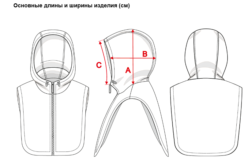 Капюшон шлемовидной формы с манишкой умеренного объема из трикотажного полотна. Передний срез капюшона оформлен кулиской с регулировкой для лучшего прилегания. Закрывает голову, шею и грудь. Манишка и капюшон с центральной застежкой на тесьму «молния».