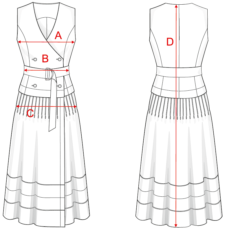 Платье с прилегающим лифом и пышной юбкой, с застежкой на 2 ряда петель и пуговиц спереди. Дополнительно застежка при помощи съемного пояса. Прилегание на лифе образуется за счет рельефов на спинке и полочке. На полочке напуск, настроченный на юбку. На юбке мелкие защипы по верхнему срезу деталей полочки и спинки. По низу юбки два ряда декоративных полос – нашивок. Платье без рукавов, горловина и проймы обработаны подбортом и цельнокроеной обтачкой. Длина платья до щиколотки.