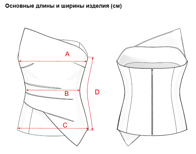 Выкройка топа корсажного типа приталенного силуэта, на притачной подкладке. Лиф двойной с декоративной накладной деталью с драпировкой складками с одной стороны и нагрудной вытачкой с другой. Топ малого объема в области лифа с расширением к низу, с рельефами. Застежка на разъемную молнию по среднему шву спинки. Длина топа выше уровня бедер.