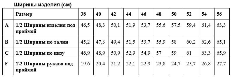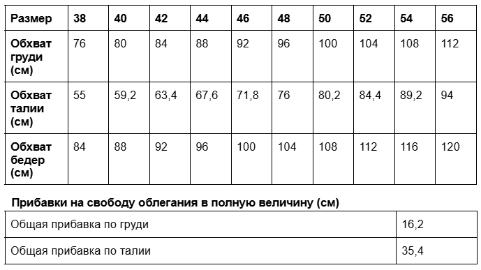 То есть, например, в 40м размере обхват по груди в изделии в полную величину будет равен 96,2 см. Вы можете выбирать размер исходя из своего обхвата груди и желаемой посадки изделия.